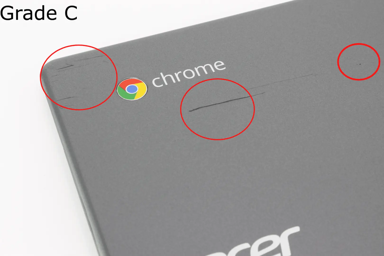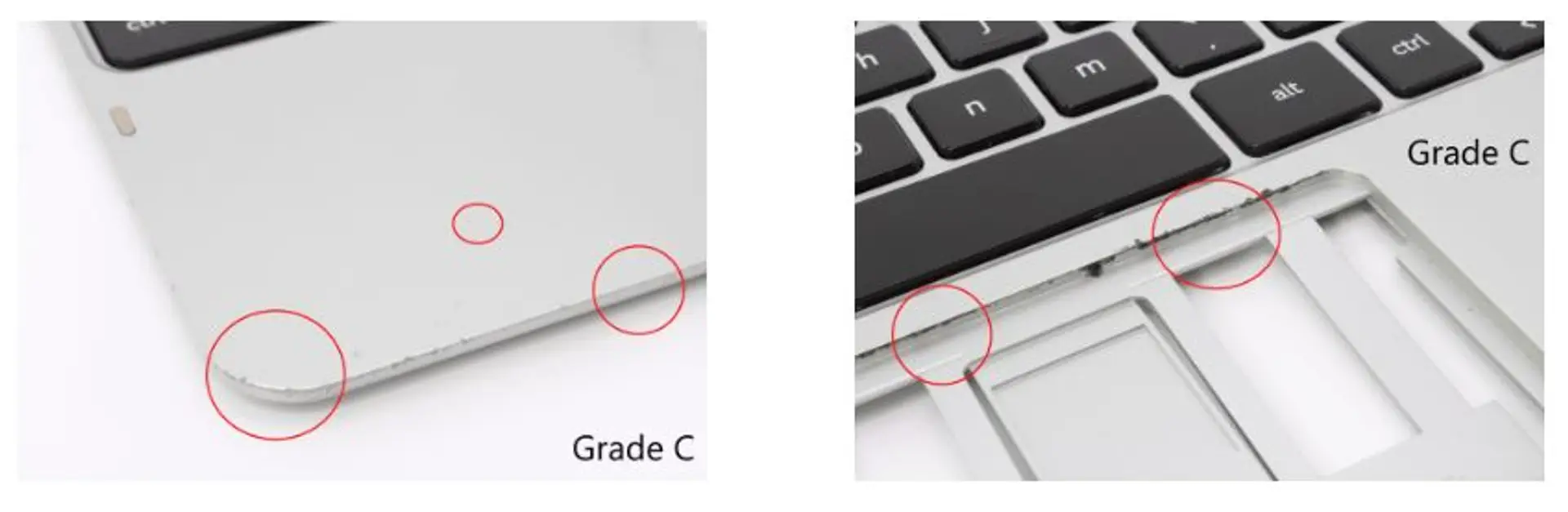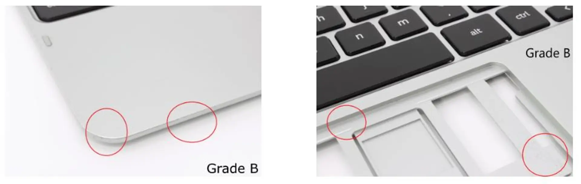 Palmrests are tested and is fully functional. All keys are present. Palmrest may have deep scratches, small cracks, and discoloration. Keys may have significant scratches and keycap wear. There are more cosmetic blemishes than a Grade B product and blemishes are significantly more visible.