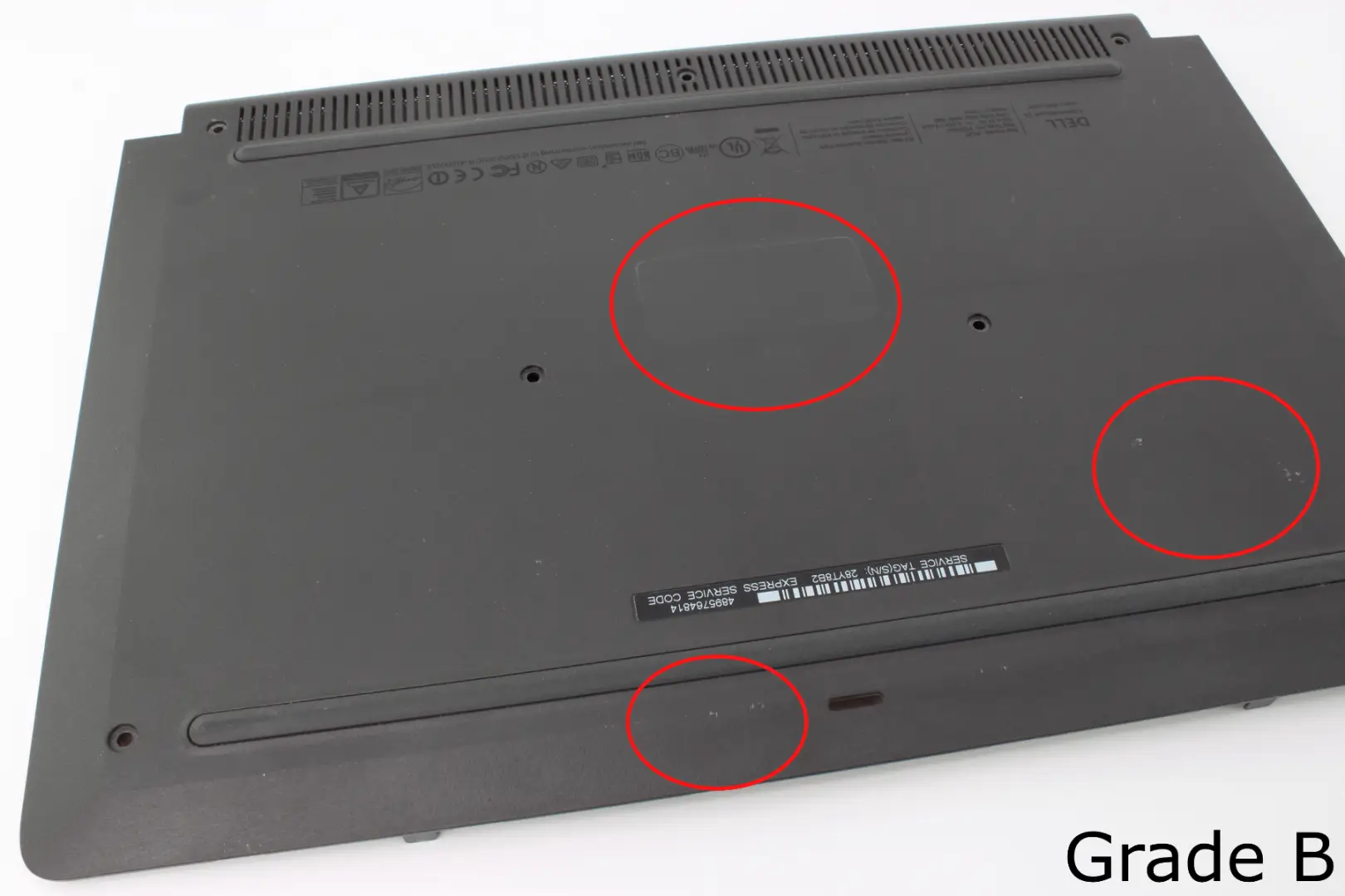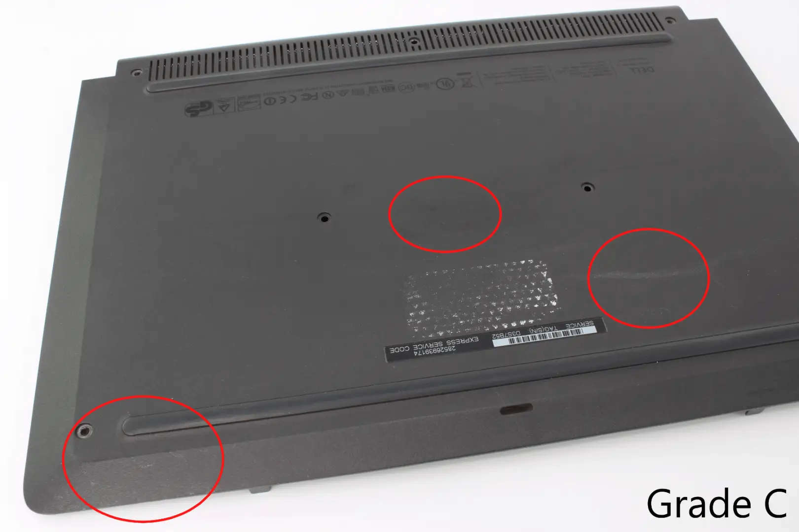 Bottom Cover is fully functional. Bottom cover may have deep scratches, small cracks, and discoloration. There are more cosmetic blemishes than a Grade B bottom cover and blemishes are significantly more visible. Rubber feet may be missing or damaged. Stickers may be missing or damaged.