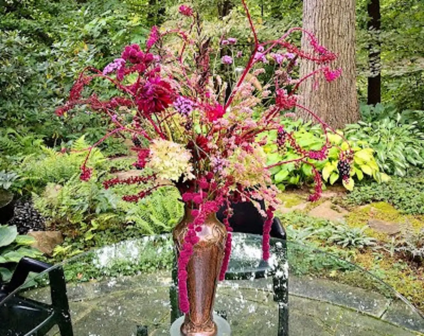 Because these shades are muted, they feel timeless. So, your flower designer might suggest pairing dusty blue delphinium with mauve garden roses and soft lavender. Then, they’ll build it up with textured foliage.