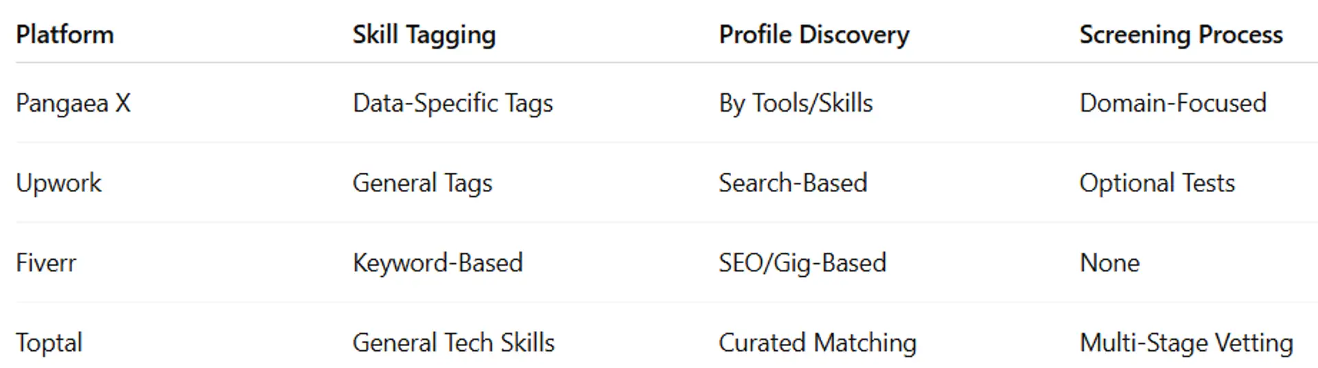 Pangaea X is dedicated solely to data and analytics-related work, offering a platform where both freelancers and clients are aligned by domain. In contrast, Upwork and Fiverr serve broad categories, often requiring data professionals to sift through unrelated or ill-defined listings. Toptal provides high-quality opportunities but caters more generally to tech and design roles.
