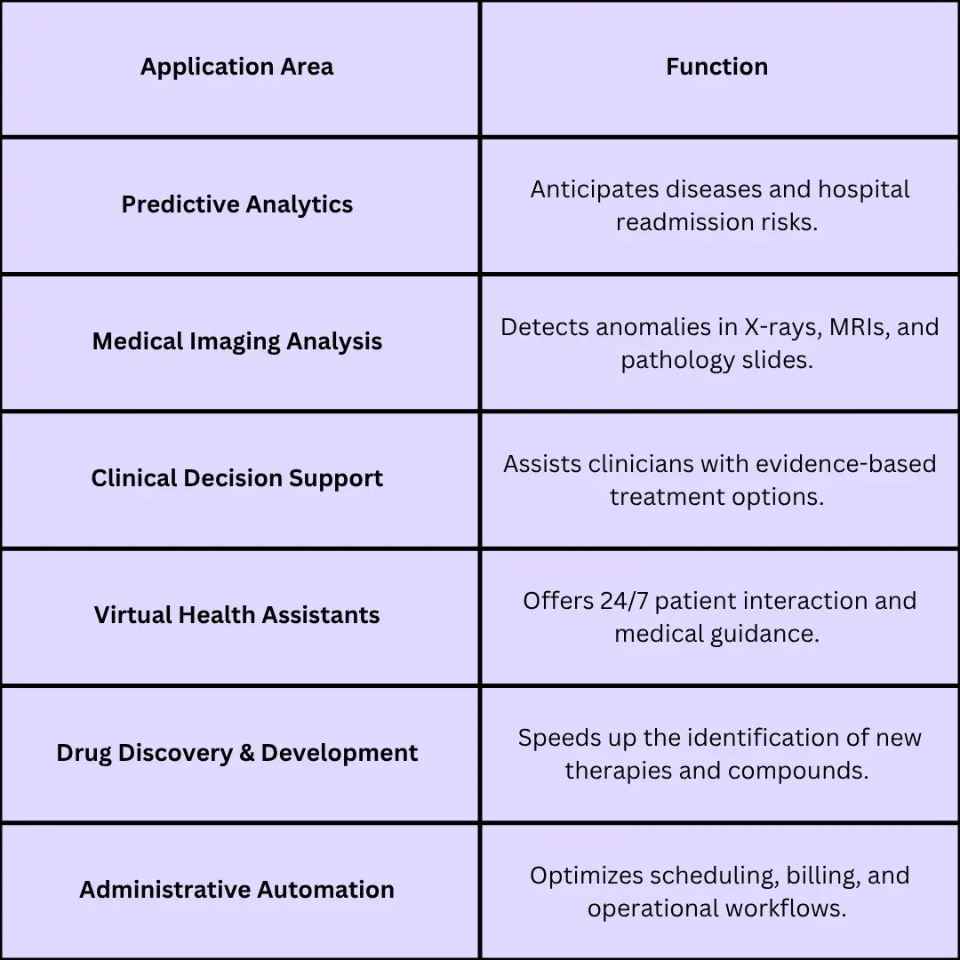 AI is reshaping multiple aspects of healthcare services. Here’s a table summarizing some of its most impactful applications: