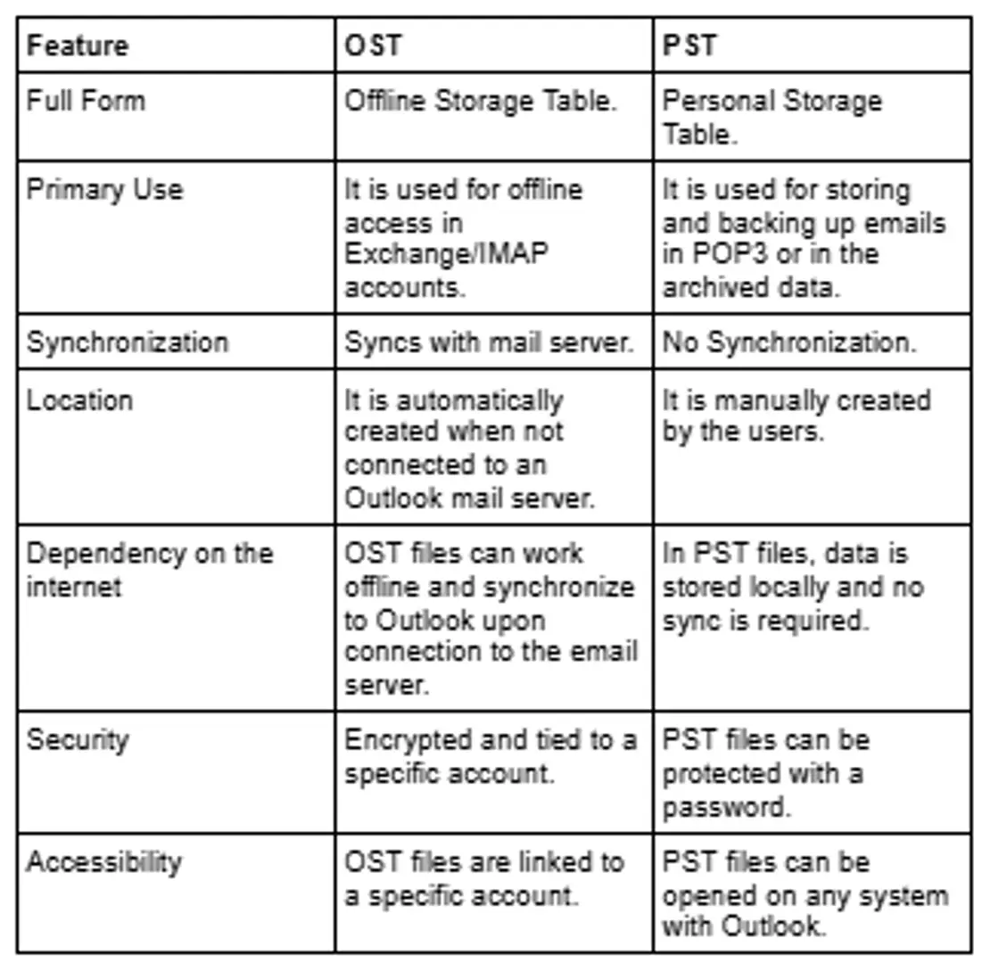 After studying about the difference between OST and PST, when to use OST and PST, its features and OST vs PST file difference, we know that understanding the difference between the OST file and the PST file for efficient management of Outlook. OST files are ideal for the server synced environment and provide offline access whereas PST files are best for transferring and archiving the data. Proper use of each file ensures the data security, reliability, accessibility which help people get the most out of Microsoft Outlook.