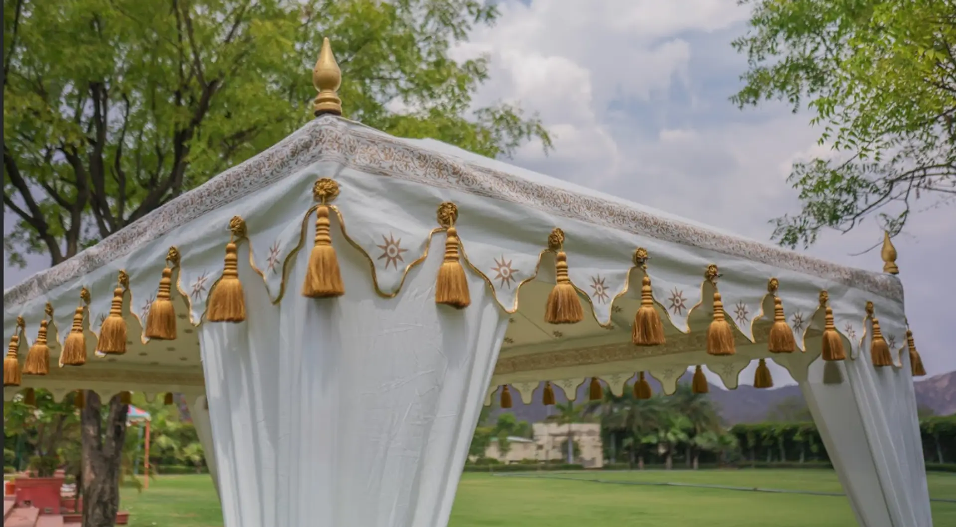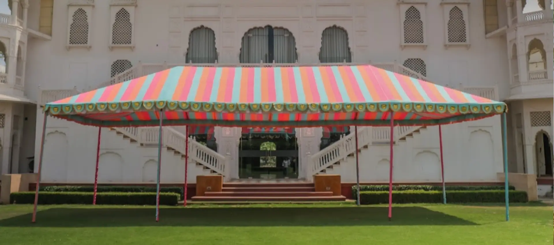 - Mughal canopy tents feature ornate hand‑block printed linings and scalloped valances—perfect for cultural authenticity .
