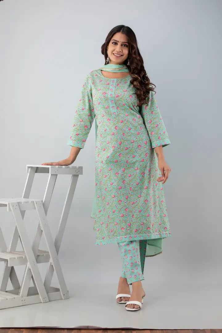 Traditional hand block prints on soft cotton fabrics are timeless. These kurta sets with dupatta are perfect for brunches, shopping sprees, or even office wear.