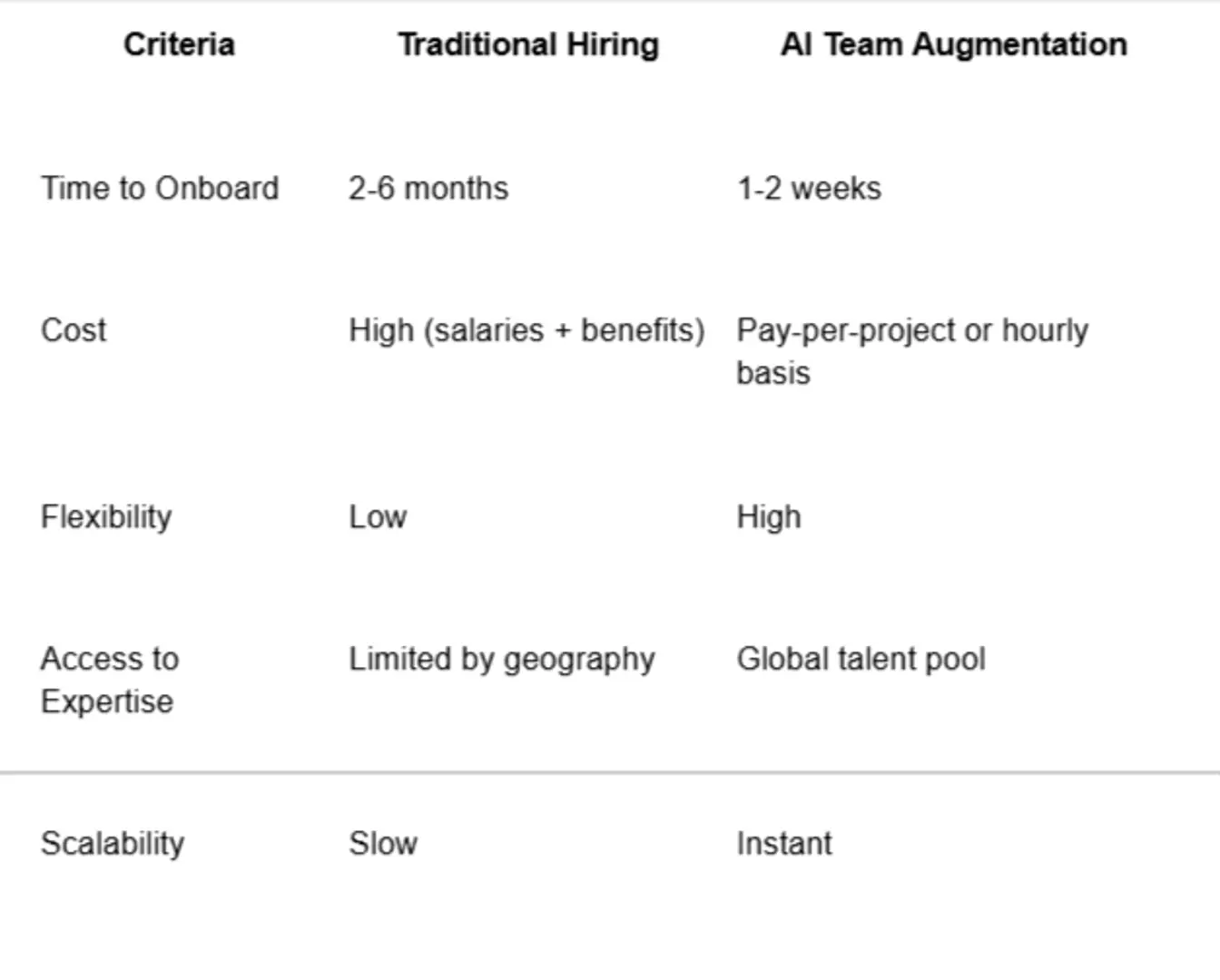 Here’s a quick comparison to show why AI staff augmentation services are a smarter choice than traditional hiring in 2025:
