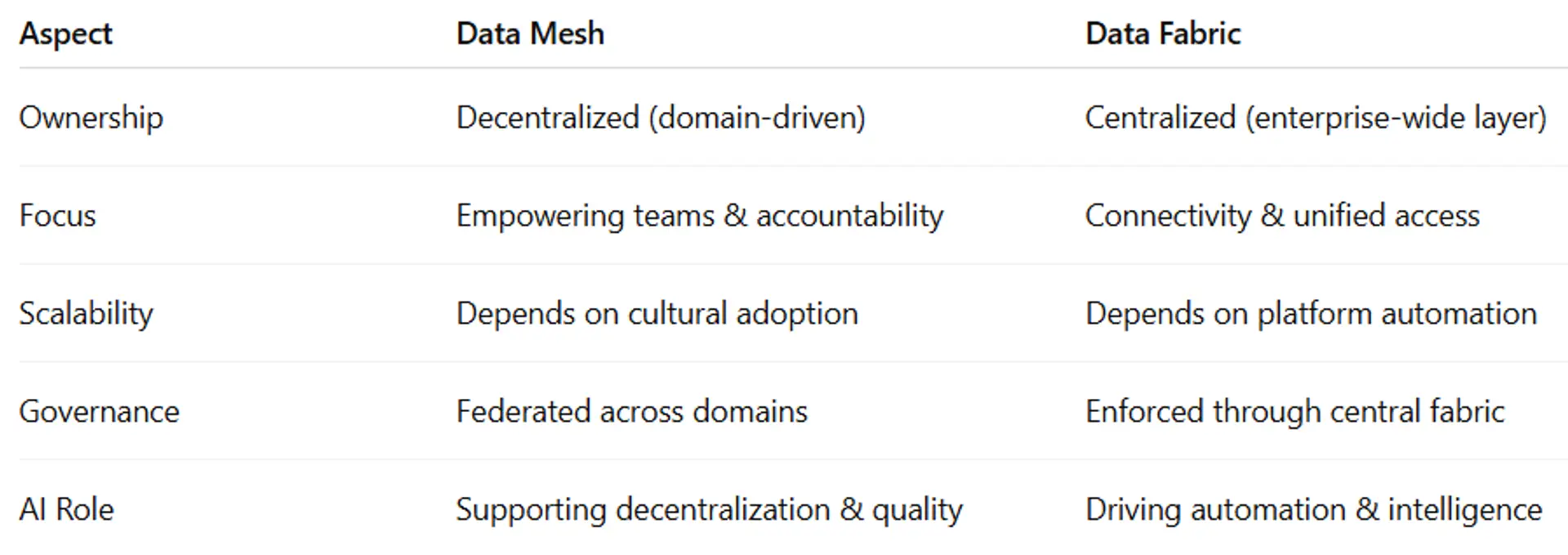 As enterprises scale their AI ambitions, the choice between Data Mesh and Data Fabric is not binary. Both represent essential strategies for building resilient, adaptable data architectures. Organizations that can harmonize these approaches will unlock faster innovation, stronger governance, and greater business agility.