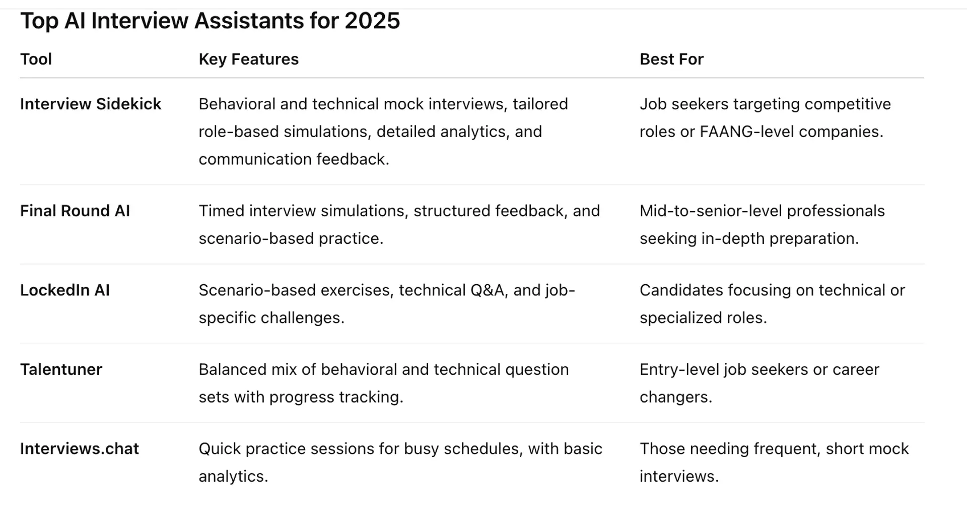AI interview assistants are reshaping how candidates prepare for interviews. Tools like Interview Sidekick, Final Round AI, and LockedIn AI provide tailored simulations, instant feedback, and actionable insights. Whether you’re an entry-level job seeker or an experienced professional aiming for a competitive role, these AI-powered platforms can help you stand out, build confidence, and secure your dream job.