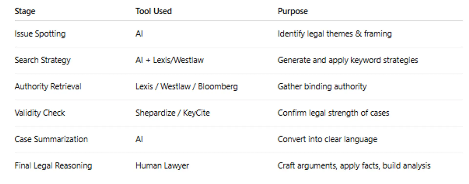 AI assists thinking. Legal databases confirm truth. The lawyer ensures accuracy.