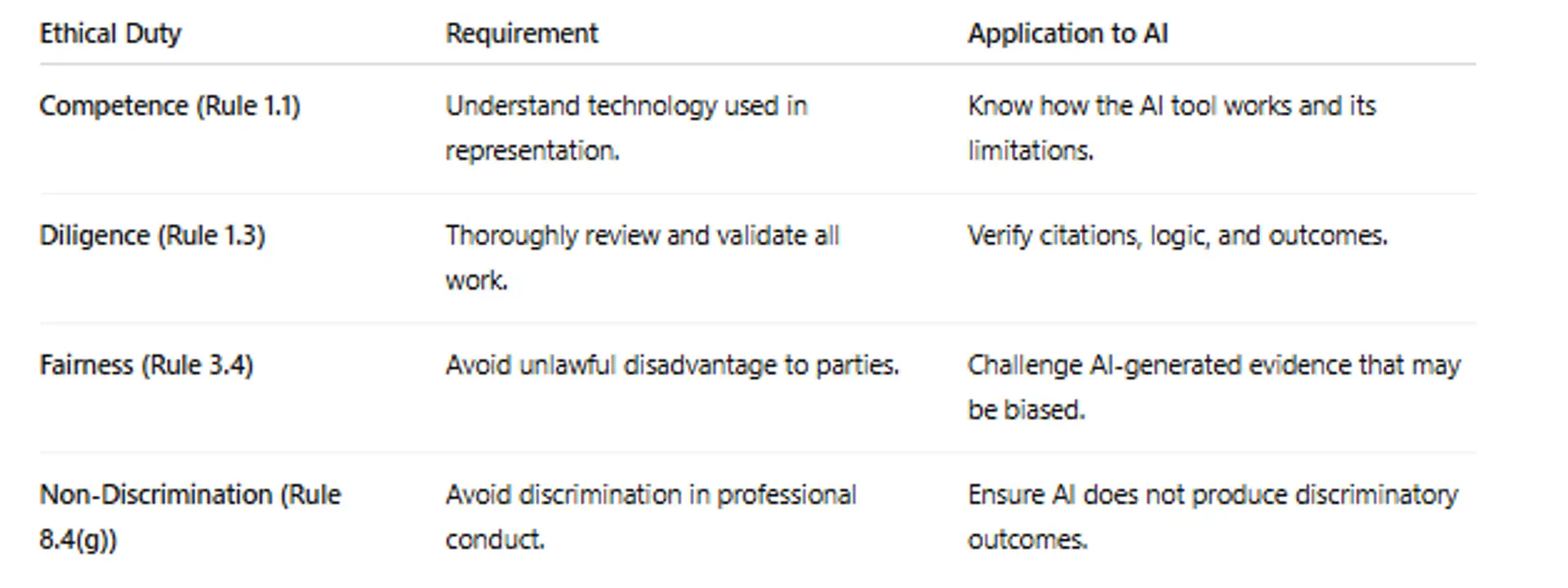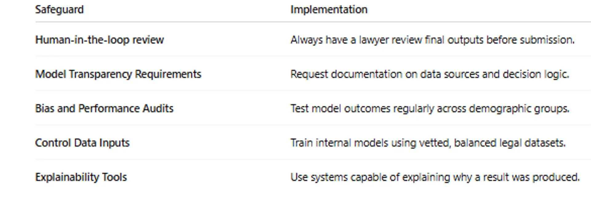 AI can improve efficiency in legal practice, but it must be used responsibly. Bias in data or model design can lead to unfair or unequal outcomes, and reliability issues—such as incorrect or fabricated information—require careful review. Lawyers must apply human judgment, verify AI outputs, and ensure that their use of technology aligns with ethical duties of competence, fairness, and due process. The goal is not just to use AI, but to use it in a way that supports justice and protects clients.