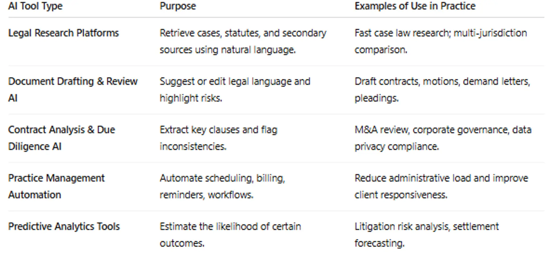 - Compare different types of AI tools used in legal practice (research, drafting, workflow automation, knowledge management, etc.).