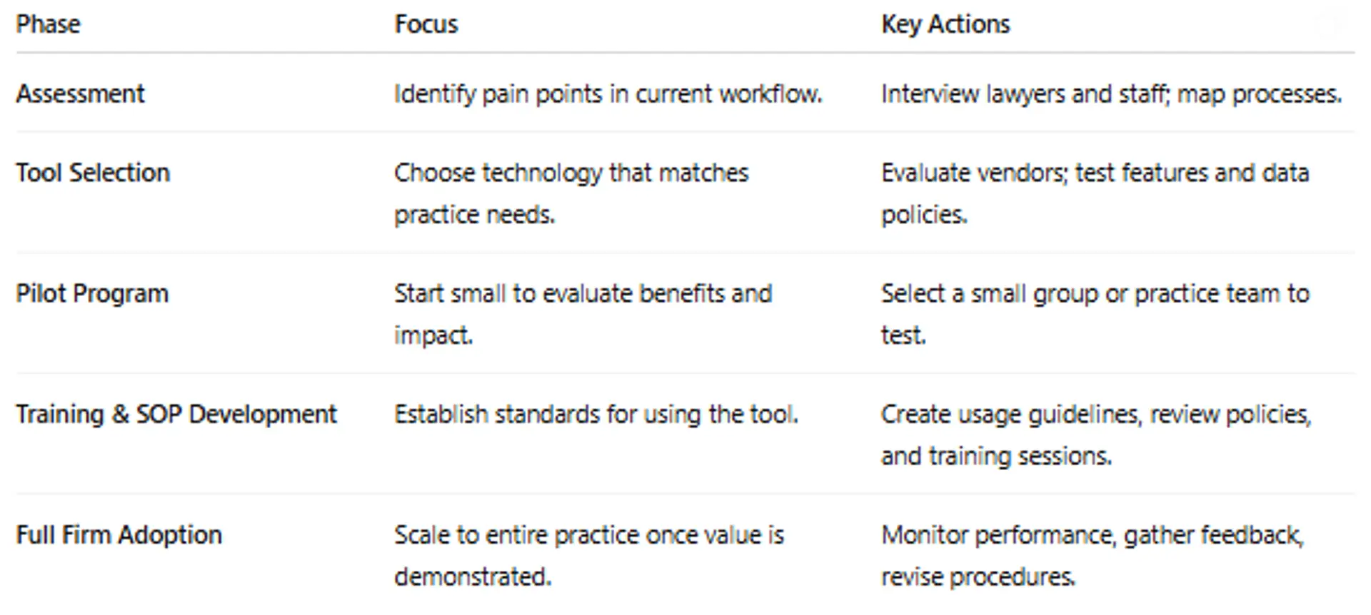 AI can significantly enhance legal practice when deployed strategically and responsibly. Effective integration requires understanding use cases, selecting the right tools, establishing governance policies, and maintaining consistent human oversight. Firms that adopt AI thoughtfully can improve efficiency, reduce costs, and increase client value — while preserving the core professional responsibilities of judgment, advocacy, and ethical practice.