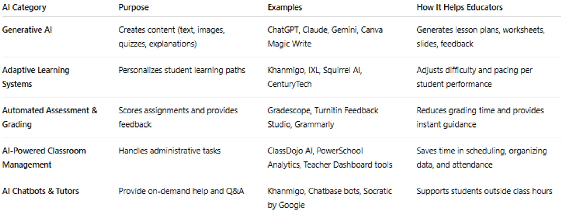 - Differentiate between generative AI, adaptive learning AI, and automation tools.