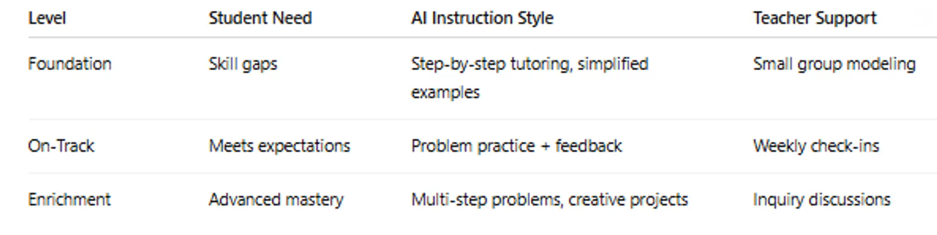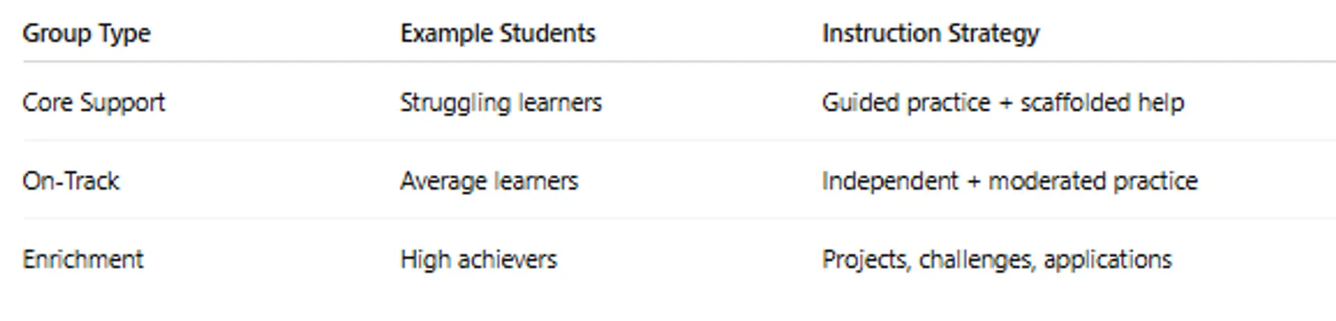 - Use AI insights (dashboards, diagnostics, performance history) to group students and assign interventions.