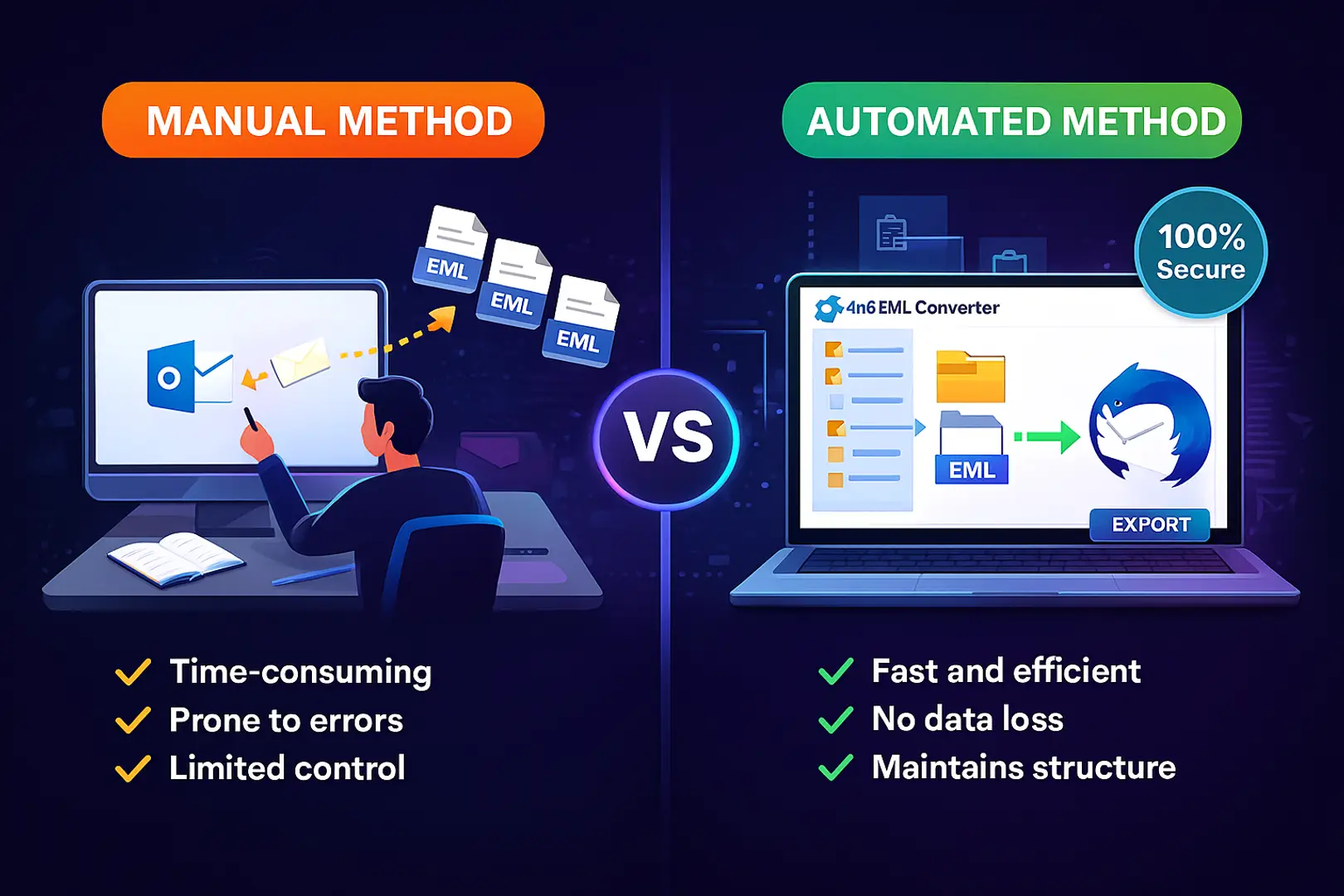 The manual ways cannot import emails from Outlook to Thunderbird in bulk while keeping the original hierarchy and formatting intact. It can’t handle thousands of EML emails altogether.