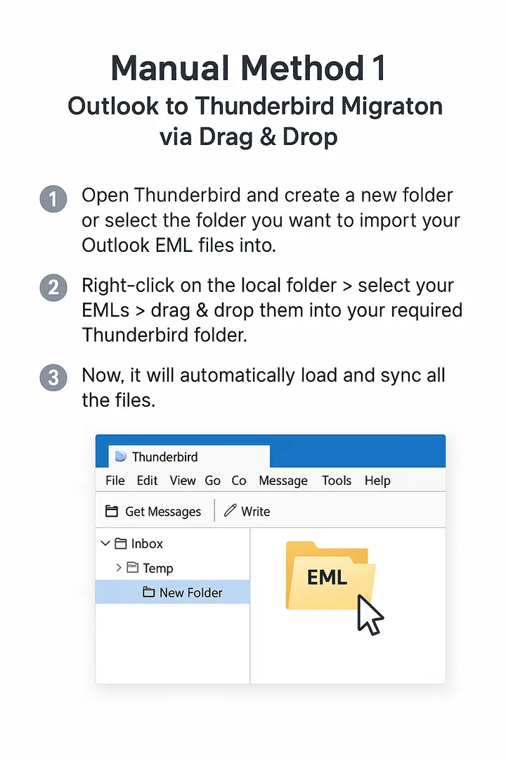 You can transfer emails from Outlook to Thunderbird using Outlook and Thunderbird email clients via drag & drop or add-ons, or if you want to move EML emails directly in bulk, you can use the automated EML converter tool. Manual ways are time-consuming and are not meant for bulk import; on the other hand, the expert tool can handle thousands of EMLs altogether without data corruption. Let’s discuss both methods briefly in the blog further.